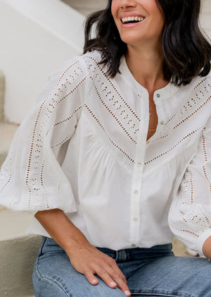 FINAL SALE - Introducing the Fleur Shirt, a timelessly chic piece that seamlessly blends vintage charm and modern elegance. This cotton broderie anglaise shirt captures the essence of feminine sophistication with casual comfort and effortless style.