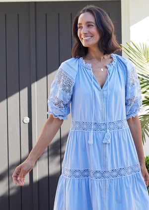 The lace trim and pintucking detailing adds a touch of femininity and sophistication to the dress, creating a delicate and romantic aesthetic.