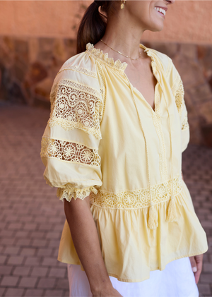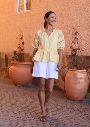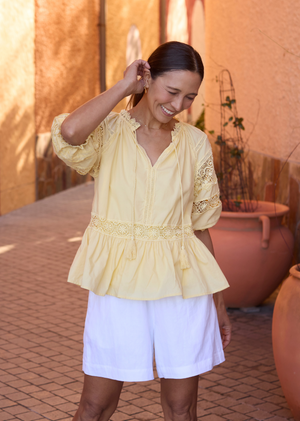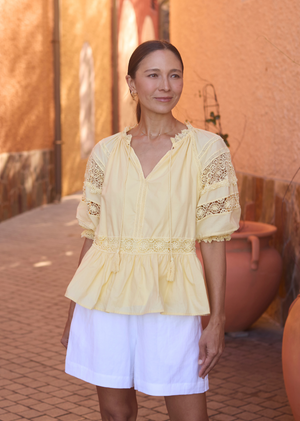 FINAL SALE - An exquisite white cotton top with lace trim, a timeless piece that effortlessly pairs with pants and short