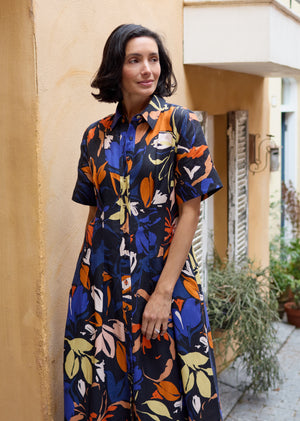 The Cleo Midi Dress in our Maisie print is a luxuriously soft, breathable linen-viscose shirtdress with waist darts, a flattering fit-and-flare silhouette and short sleeves, perfect for smart-casual dressing for any occasion.