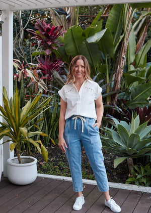 Crafted from crisp cotton poplin, the Tahlia Shirt features delicate lace details and cap sleeves with turn up cuff detail, making it the perfect choice for any occasion—be it a casual outing with friends or a day at the office.