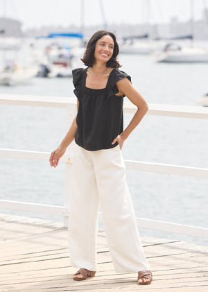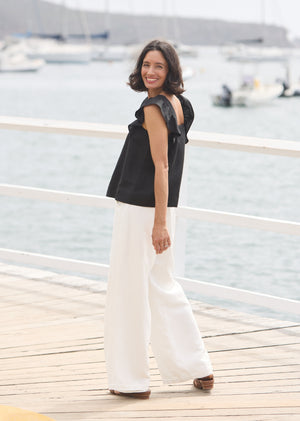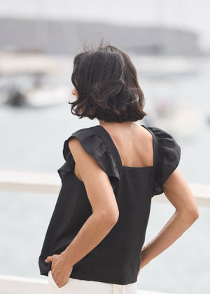 The Willow Top comes in a classic Black colour, pairing well back to any outfit. The sweet shoulder ruffles add a feminine and playful touch, making this top a versatile piece that can be paired with your favourite pair of shorts or linen pants.