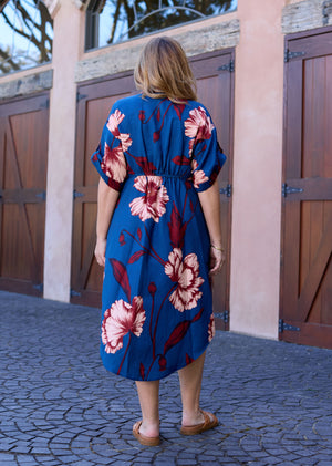 A functional, adjustable tie at the front allows you to define your waist exactly as you like, comfortable back waist elastic, while the short sleeves with cuff detail offer easy coverage and a relaxed, modern feel. The midi length with a gently shaped side hem adds movement and ease, pairing just as well with heels as it does with flats or sandals.