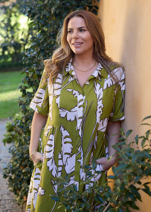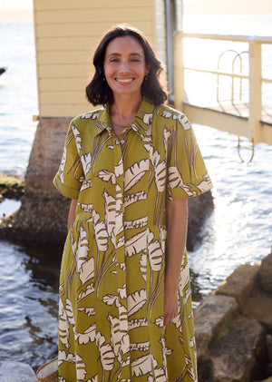A softly structured linen–viscose shirtdress in our Anouk print, with gentle bodice shaping and a floaty midi skirt that moves effortlessly from workdays to summer getaways.