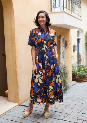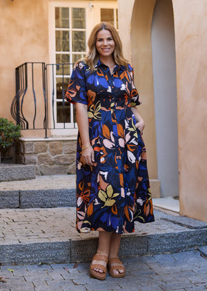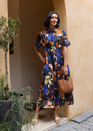The Cleo Midi Dress in our Maisie print is that effortless smart-casual piece you can rely on for any occasion. Crafted from a premium linen viscose fabric, it feels luxuriously soft while still being made from 100% natural fibres, keeping it beautifully breathable and comfortable to wear. The timeless shirtdress silhouette is elevated with stitched darts through the waist to create a flattering fit-and-flare shape that skims without clinging. Finished with short sleeves and a versatile midi length, Cleo in Maisie moves easily from desk to dinner, long lunches or relaxed weekends out.