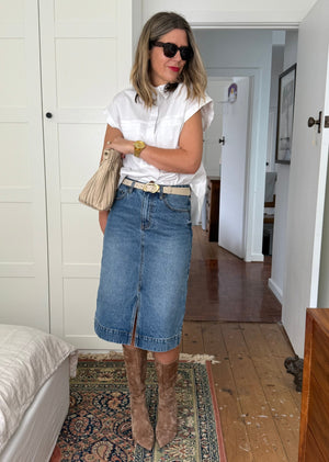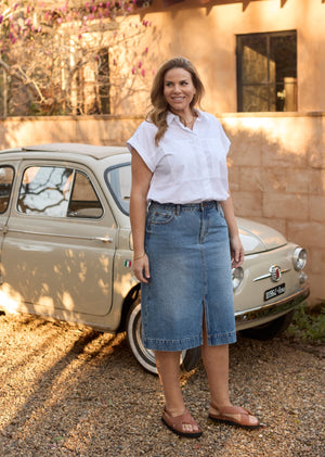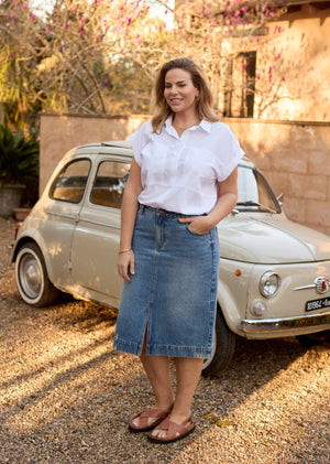 The Sloane Denim Skirt - Easy, polished, and built for everyday wear. Sloane is our classic midi denim skirt in a timeless mid-blue wash, cut to a straight silhouette that skims without clinging. Crafted from mid-weight 100% cotton denim, it holds its shape beautifully while softening with every wear. A fly front keeps things clean, and a centre-front split at the hem gives you comfortable movement from desk to dinner (and everywhere in between). Pair Sloane with a crisp shirt or a favourite tee and sandals for warm days; swap to knits and boots as the weather cools. A forever piece you’ll reach for on repeat.